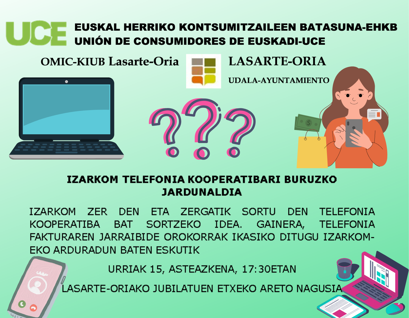 Lasarte-oriako jubilatuen etxea Beko Kale Bidea, 3,Lasarte-Oria,GipuzkoaIzarkom zer den eta zergatik sortu dugun telekomunikazio kooperatiba bat. Horrez gain, telefonia faktura bat irakurtzen jakiteko jarraibide orokorrak azalduko ditugu.