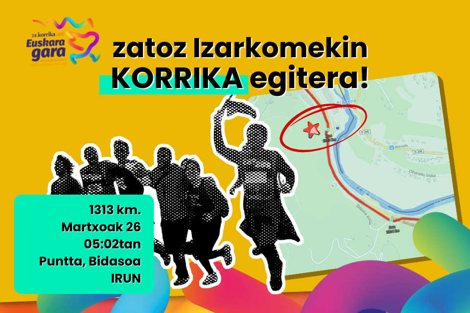 Zatoz Izarkom gurekin 1313 km KORRIKA egitera. Gurekin korrika egin nahi baduzu, goiz esnatu beharko duzu. 04:30etan gerturatu zaitezke Erromes Plazako bulegora edota 4:45etako Bidasoa Auzoko Punnta gasolindegira. Euskara Gara!